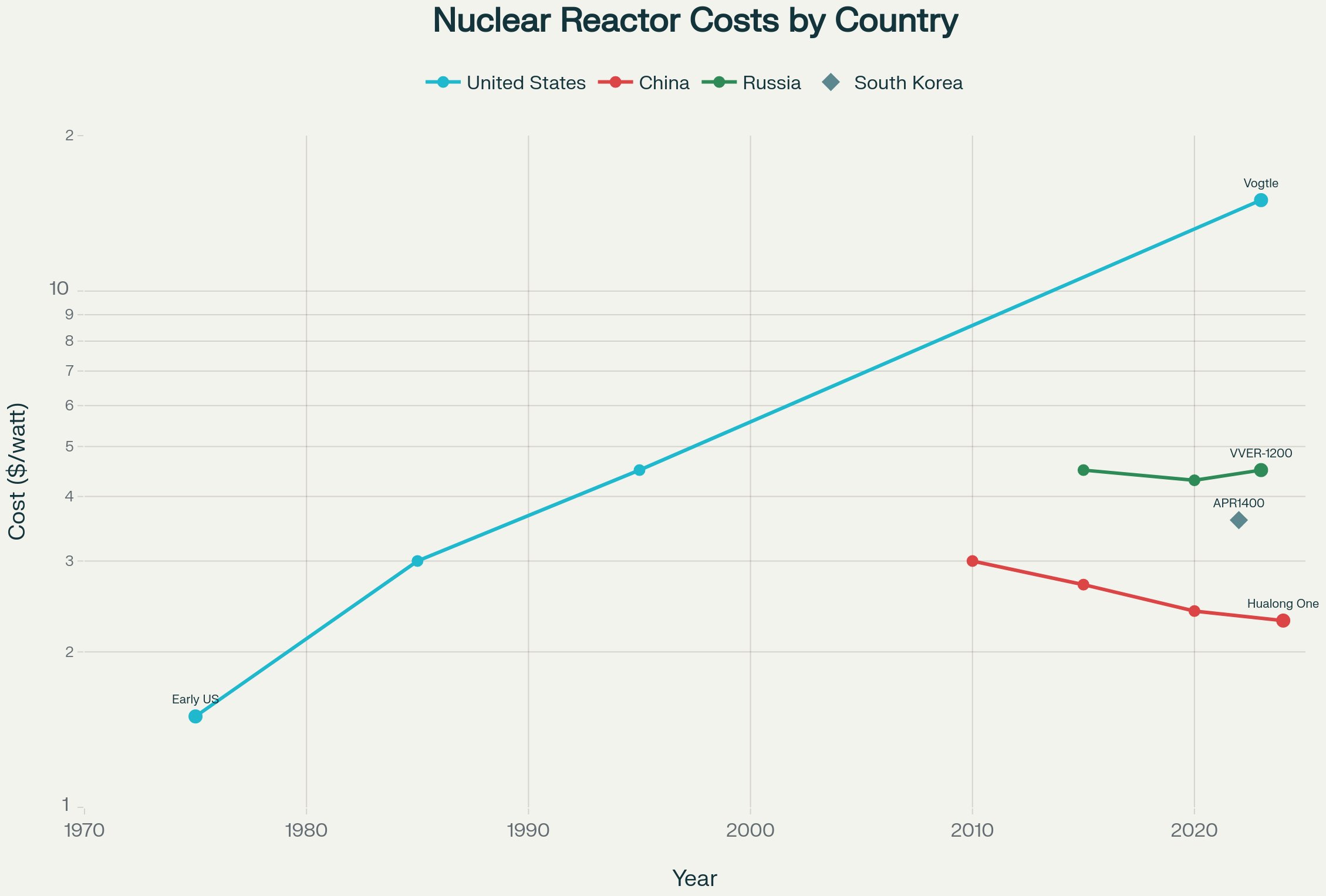 International comparison of nuclear reactor construction costs showing diverging trajectories between countries with