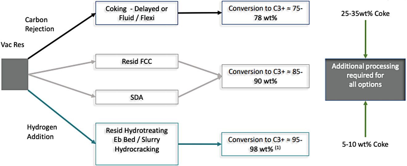 If left unprocessed, vacuum residue can only be blended into heavy fuel oil (bunker fuel) or asphalt/bitumen — typically the lowest-value products in a refinery. The principal upgrading strategies are divided into two fundamental routes: