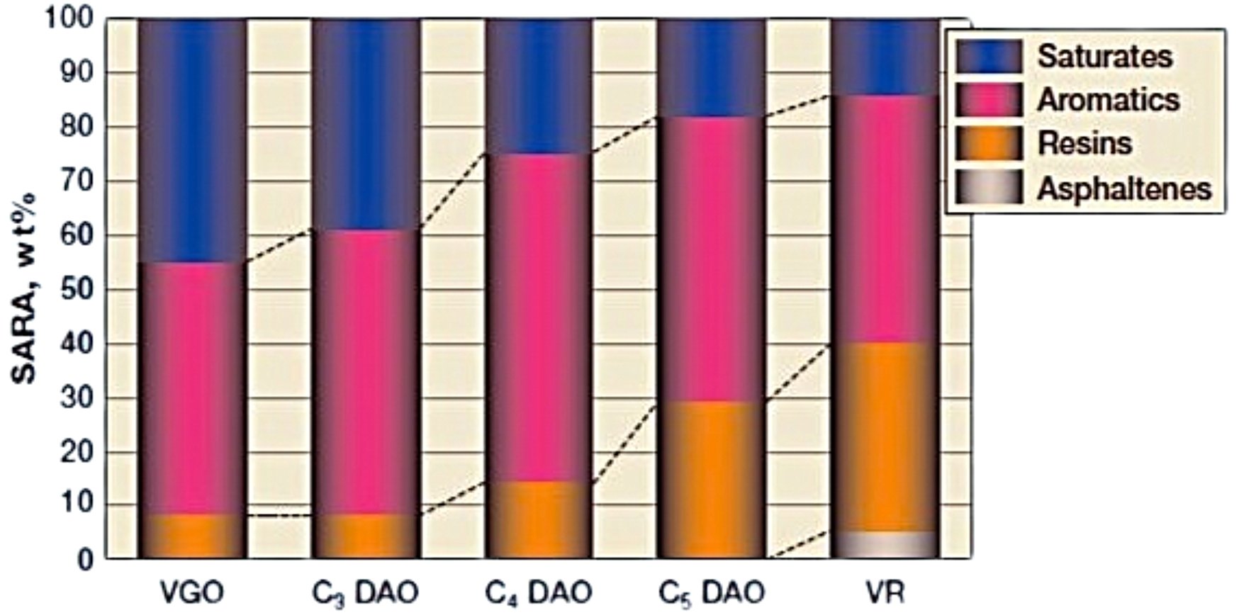 DAO exhibits significantly improved properties compared to the original vacuum residue feedstock. The removal of asphaltenes results in substantially reduced sulfur, nitrogen, and metal content (particularly vanadium and nickel), lower carbon residue, decreased viscosity, and improved color. DAO contains primarily saturates, aromatics, and resins (without asphaltenes in the SARA analysis), with higher API gravity and better viscosity index compared to the parent vacuum residue. The resin and aromatic content remaining in DAO provides it with strong solvent characteristics, making it an effective natural asphaltene solvent.
