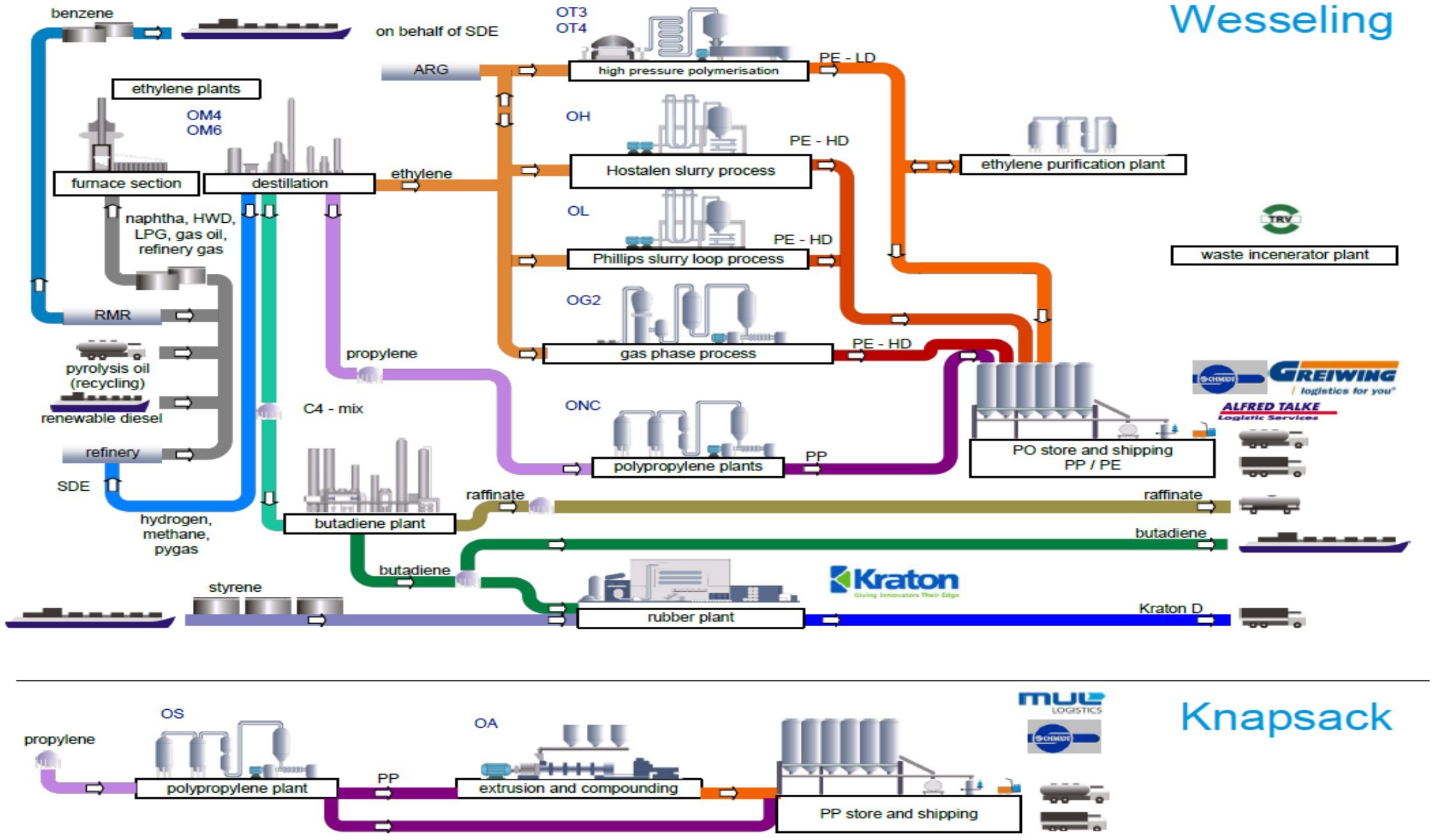 The Wesseling/Knapsack complex comprises two manufacturing sites that operate as a single integrated facility, with Wesseling itself covering more than 2.7 km² and hosting ethylene and propylene plants (steam crackers), multiple PE and PP units, an advanced polyolefins plant, and extensive utilities. Across the two sites, installed capacity exceeds 2.2 million t/y of polyolefins, supported by an on‑site power plant (about 470 MW), wastewater treatment and sewage incineration units, and dedicated logistics centers handling up to roughly 500 kt/y of polymer granulate in bulk and packaged form.