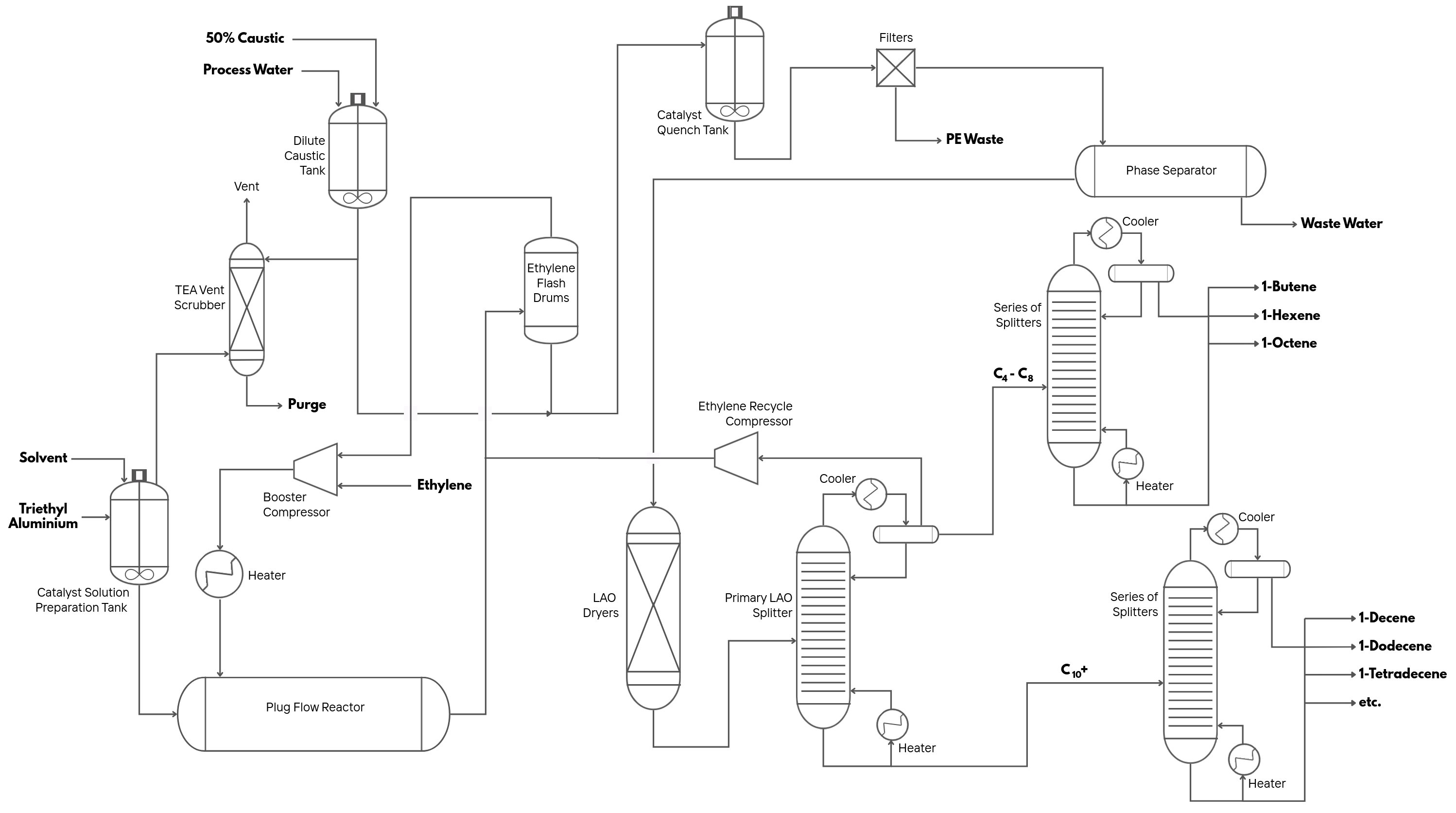 Figure 1 - Simplified CPChem Triethyaluminum-catalyzed ethylene oligomerization process flow diagram