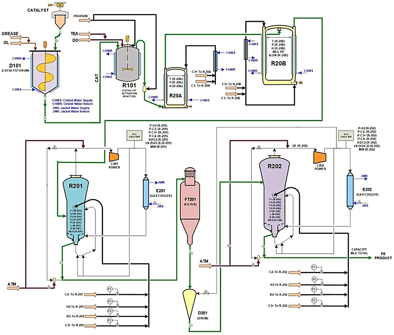 Process flow diagram of Spherilene technology with Dual Gas Phase Reactors and process variables (ATM, atmer; DO, donor; TEA, teal.