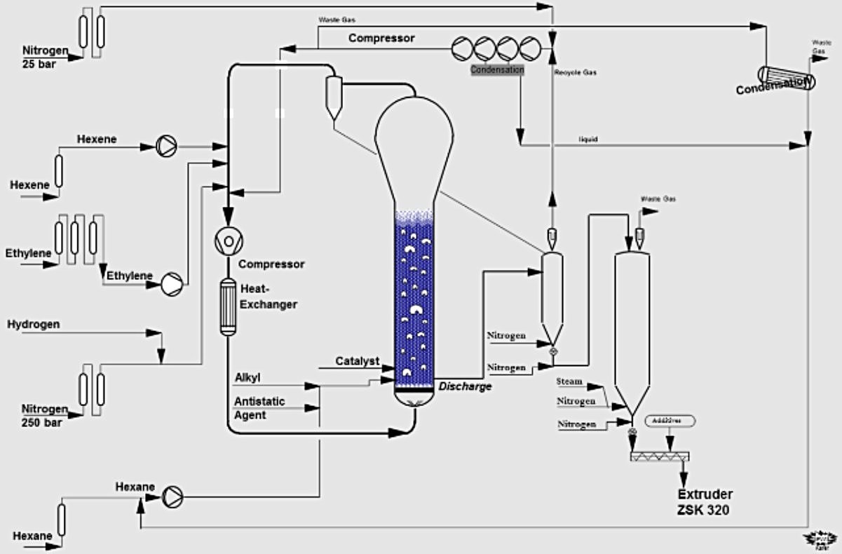 Lupotech G is a proprietary gas-phase polyethylene process developed by BASF in the 1990s, designed for the production of high-density polyethylene (HDPE), and medium-density polyethylene (MDPE). Its development was rooted in BASF’s expertise in catalysts and process engineering, targeting efficient, versatile, and cost-effective PE manufacturing using fluidized-bed reactor technology.