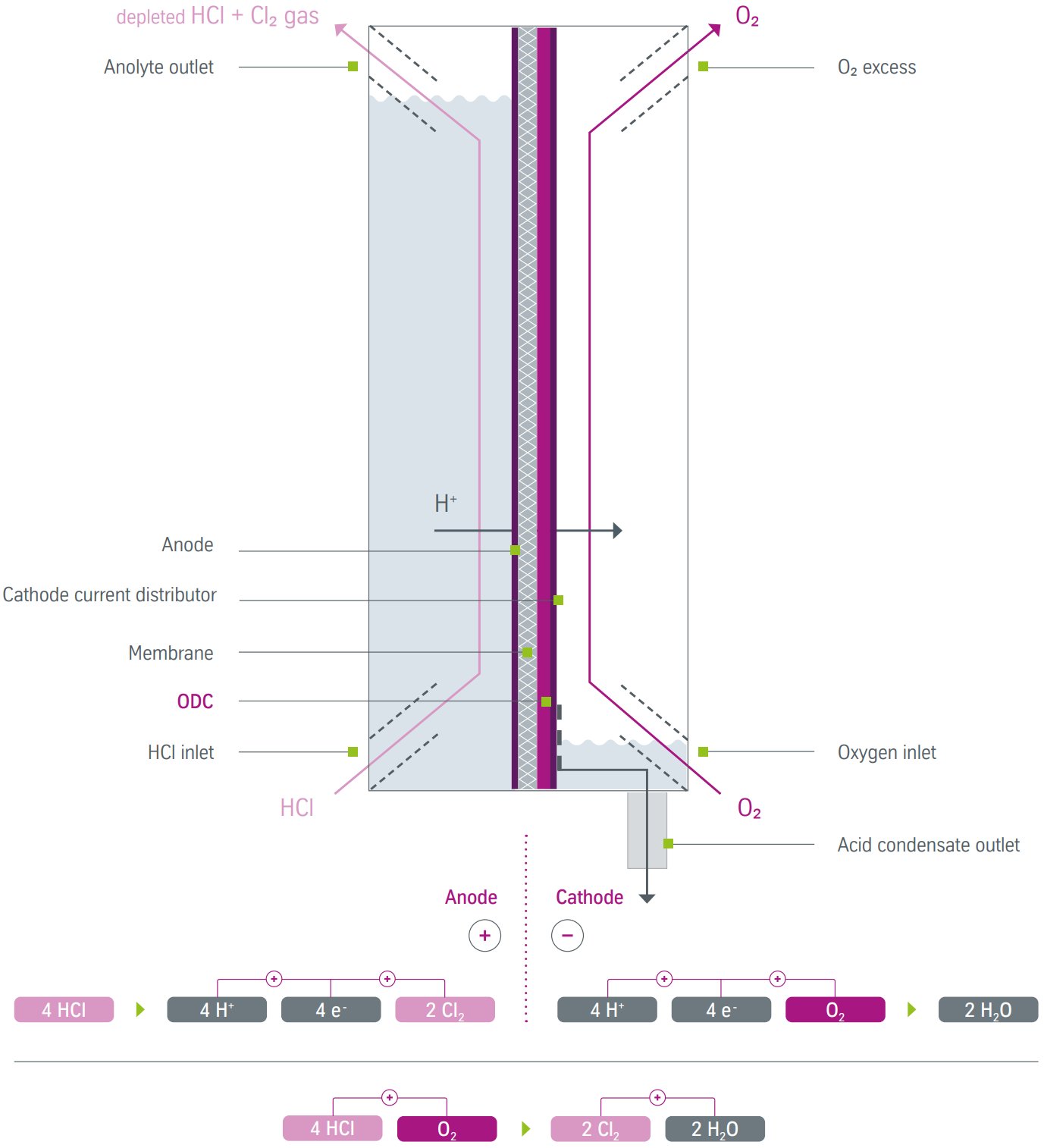 4 HCl + O2 → 2 Cl2 + H2OCompared to the Standard reaction for hydrogen generation, the ODC Process reduces the required operating voltage by approximately 1 volt, resulting in consequent energy savings.