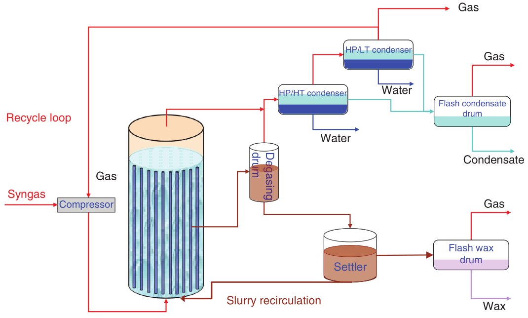 A generic FT process flow, independent of feedstock, comprises syngas generation and cleaning, FT synthesis in one of these reactor types, primary cooling and phase separation, and product fractionation and upgrading. Syngas is produced upstream via gasification (for coal, biomass, residues) or reforming/partial oxidation (for natural gas or light hydrocarbons), then cleaned of particulates, sulfur, halides and tars, and adjusted in H2:CO ratio before entering the FT reactor. The FT section operates typically in a low-temperature or high-temperature regime, with pressure chosen to balance catalyst performance, heat removal and compression cost, and the hot effluent is cooled to condense water and hydrocarbons for separation into gas, liquid and aqueous streams.