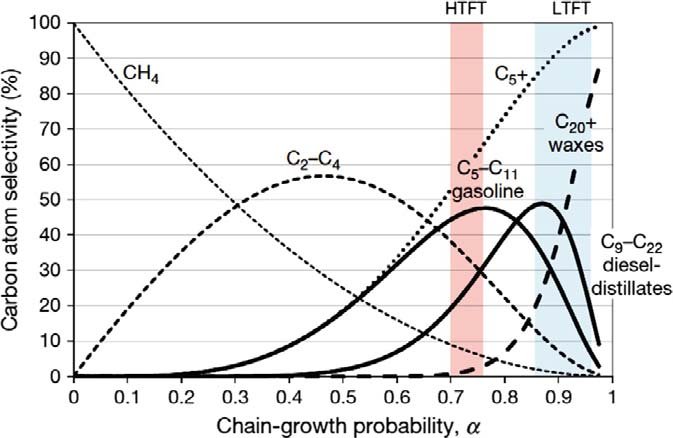 Kinetically, FT is best viewed as a surface polymerization in several generic steps: adsorption of reactants, CO activation and formation of surface CHx or carbide species, chain initiation, chain growth via C–C coupling and chain termination by desorption. The overall chain-length distribution of hydrocarbons is often approximated by the Anderson–Schulz–Flory (ASF) model, characterized by a chain-growth probability parameter that depends on catalyst, temperature, pressure and gas composition, although modern studies show deviations from ideal ASF behavior and the possibility of tailoring catalysts for specific olefinic or waxy product slates.