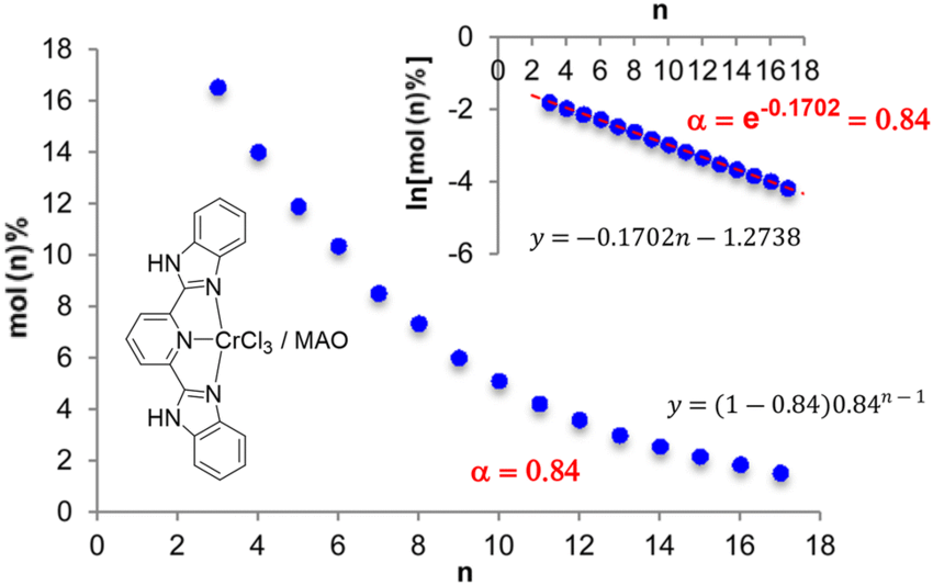 This non-selective oligomerization involves a Cossee-Arlman mechanism where transfer reactions are favored over propagation reaction. Indeed, β-H elimination is strongly promoted compared to coordination and insertion of ethylene. This specific kinetic feature leads to the production of short hydrocarbon chains from C4 to C30 in a decreasing yield sequence, most commonly following a Schulz-Flory distribution (Fig. 1) or by a Poisson distribution depending on process configuration.
