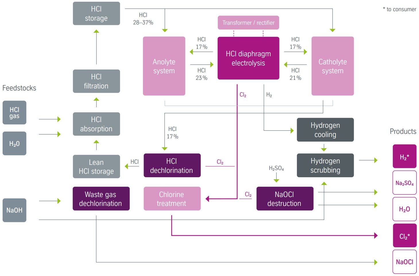 - Hydrogen safety systems to prevent H2/Cl2 mixing